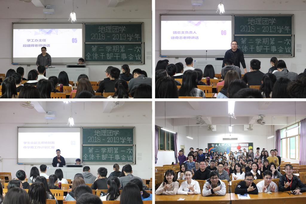 会上,团总支副书记何奇举、学生会副主席姚创瀚及各部门代表分别对团学各部门上一学期工作进行总结,并对本学期工作计划进行汇报。段建辉老师对新学期安全及维稳工作进行布置,团总支负责人徐奇志老师对团学上学期取得的成绩给予了充分的肯定,对全体同学们的付出表示感谢,并对新学期的工作提出要求:一是各部门要撸起袖子加油干,做好“地理风情节”系列活动的安排与部署工作,擦亮学院品牌做出成效;二是全体学生干部要在学习生活当中要起到模范带头作用,提高安全防范意识,协助好本班内学生事务工作;三是不忘初心,牢记使命,进一步加强团学内部建设和相关培训,提高团学队伍的整体素质。