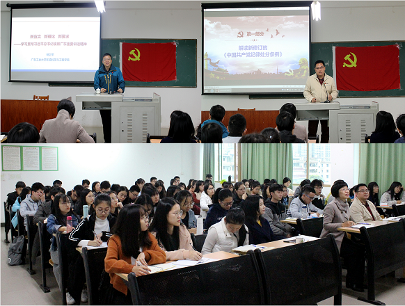 12月9日上午,地理学院在公颜实训大楼C座301举办学生党支部专题党课题,邀请广东工业大学环境科学与工程学院党委书记杨卫平和副书记陈辉主讲。讲座由该院党总支书记程洁如主持,各支部书记、学生党员和入党积极分子等近百人参与了党课学习。