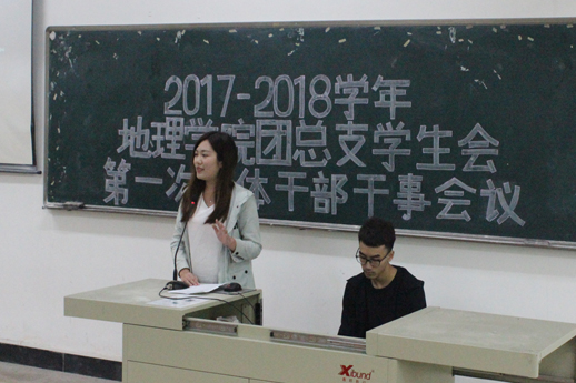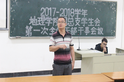 会议开始,主持人向新干事们介绍了我院的三位辅导员老师以及团学的五大主干,对新干事们的加入表示热烈欢迎,并指出工作计划在工作实施中的重要性。学工办主任曾宇翔老师首先发表讲话,对团学开学以来的工作进展做出了充分肯定,并向新干事们系统地介绍了地理团学,希望新干事们要有良好的时间观念,能找准好自己的工作定位,在部长的带领下做好任务的执行者,完成好自己的工作,并且鼓励新干事们要发奋努力,一起建设好地理团学。