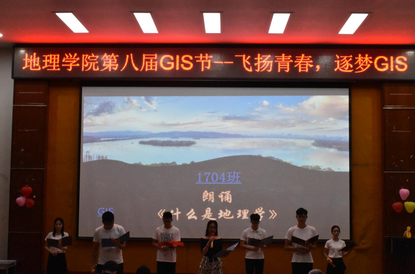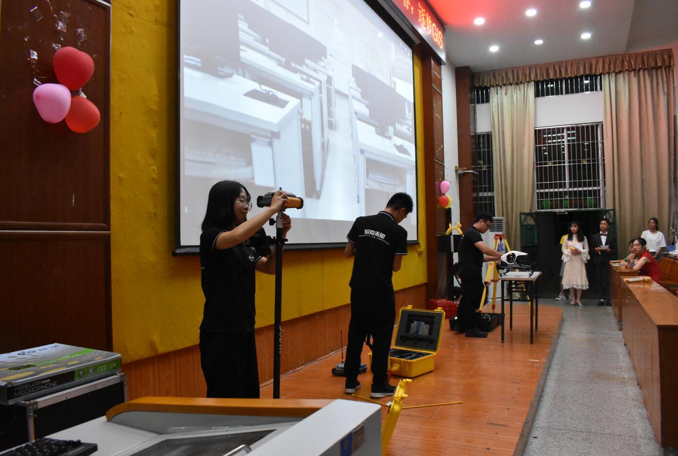 往届毕业生有的还以视频寄语等方式表达了心声,17级、18级的同学进行了才艺表演,呈现了以GIS为主题的小品、情景剧、歌曲、朗诵等精彩节目,期间还穿插了专业知识相关的游戏环节。最后还由GIS实验室学生团队成员展示了各类测绘仪器,主要有全站仪、无人机等。现场活动气氛十分热烈,同学们感受到了GIS大家庭的温暖。