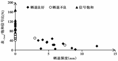 图3 岩芯晒退深度与表~2mm/饱和信号比散点图