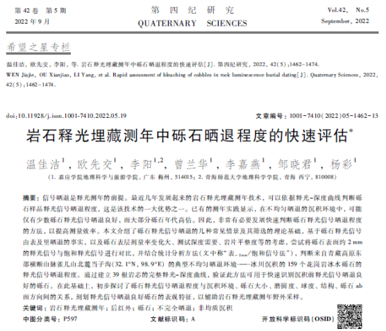 我院1901班温佳洁以第一作者在国内地质学领域权威期刊《第四纪研究》2022年第5期上发表了题为“岩石释光埋藏测年中砾石晒退程度的快速评估”的论文(图1),地貌演化与释光测年团队欧先交、曾兰华老师为通讯作者。《第四纪研究》是北大核心、CSCD核心期刊,在国内学术界影响力较大,这是我院本科生首次以第一作者身份在该级别高水平学术期刊上发表论文。