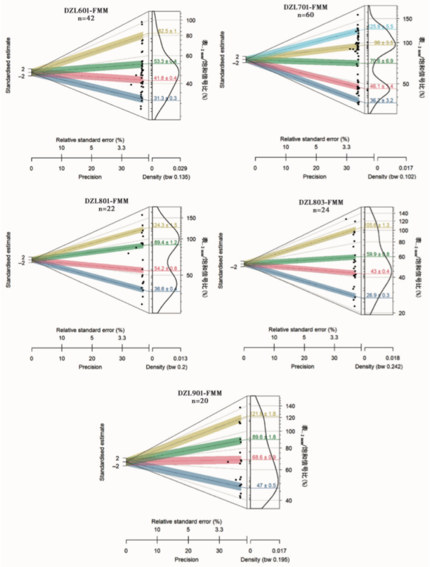 图2 各个采样点砾石岩芯的表~2mm /饱和信号比有限混合模型图
