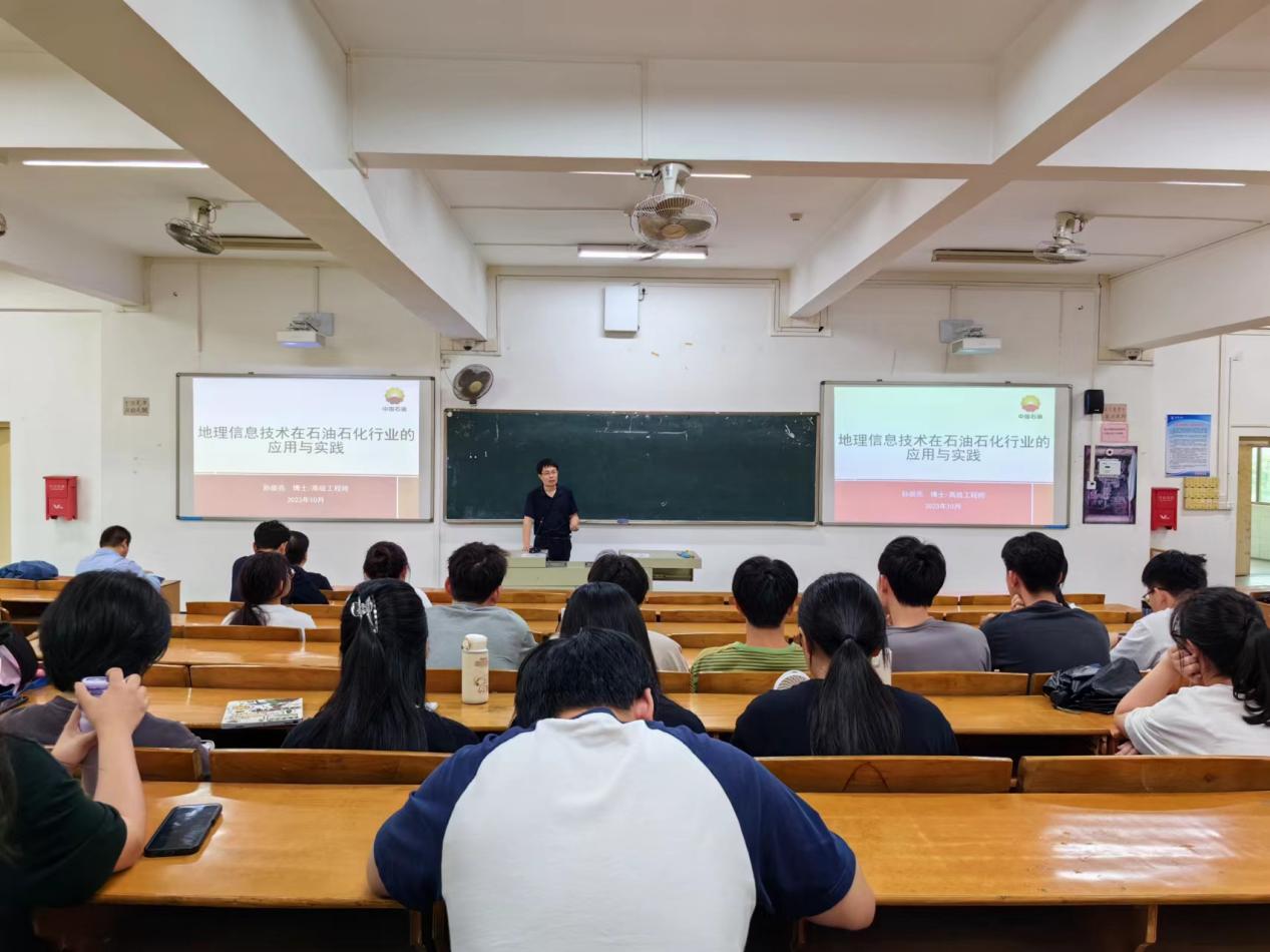 此次讲座邀请了大庆油田孙崇亮博士为广大师生做报告。孙崇亮博士做了题为“地理信息技术在石油石化行业的应用与实践”的学术报告。报告聚焦石油石化行业的地理信息技术应用现状与案例,与大家分享了建设内容、关键技术、安全保障、应用成效等方面内容。