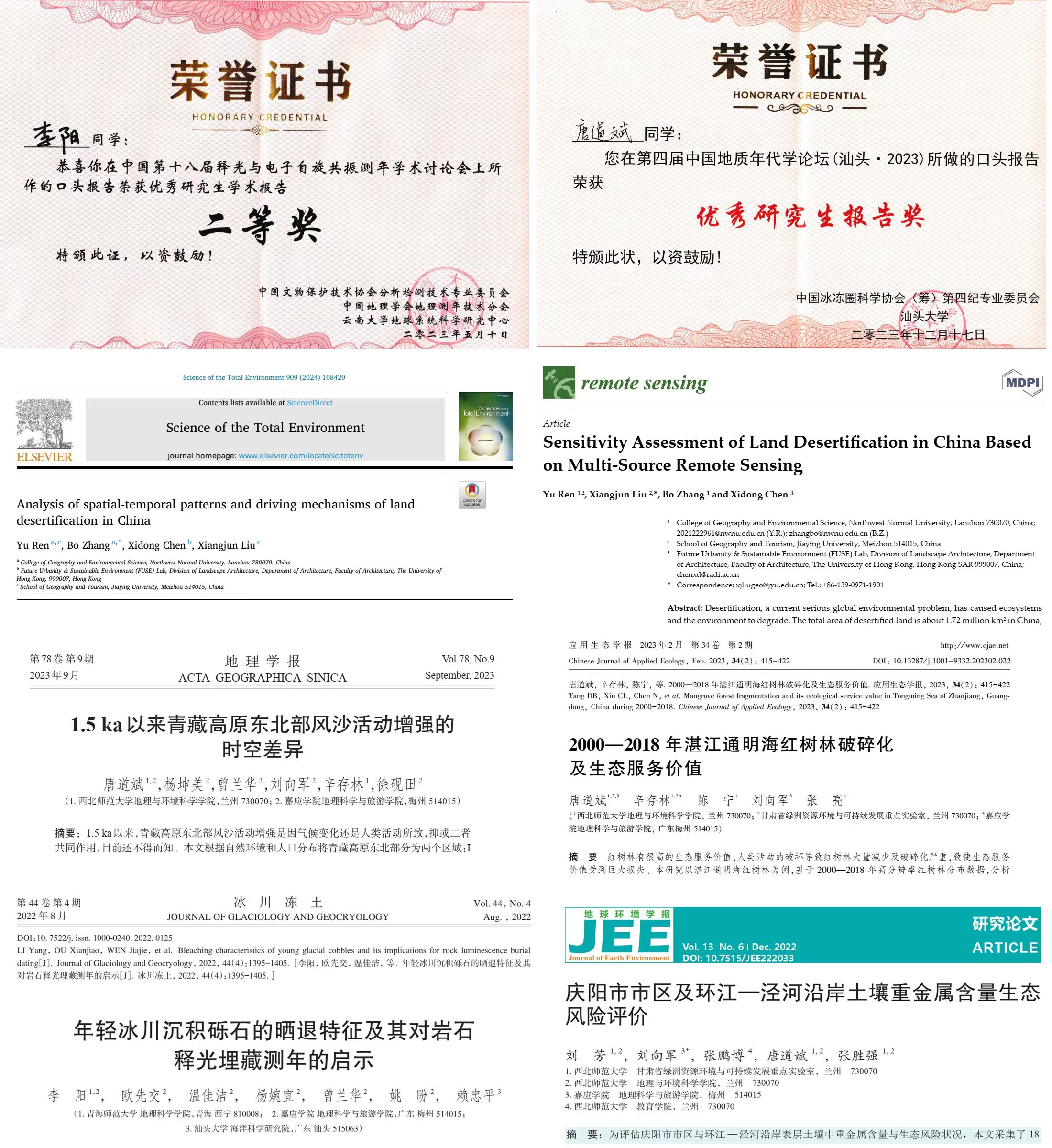 我院校地理科学与旅游学院与外校联合研究生培养取得系列成果。我校院与青海师范大学联合培养的硕士研究生李阳在中国第十八届释光与电子自旋共振测年会议 (2023年)上做口头报告获优秀研究生学术报告二等奖;我院校与西北师范大学联合培养的硕士研究生唐道斌在第四届中国地质年代学论坛(2023年)做口头报告获优秀研究生报告奖。我院校与西北师范大学联合培养的硕士研究生任雨在Science of the Total Environment(2023年,中科院一区TOP,影响因子9.8)和Remote Sensing(2023年,中科院二区TOP,影响因子5)上发表了两篇学术论文。唐道斌在《地理学报》(2023年,中文权威期刊)和《应用生态学报》(2023年,中文核心期刊)上发表了两篇学术论文;李阳在《冰川冻土》(2022年,中文核心期刊)发表了一篇学术论文。我院校与西北师范大学联合培养的硕士研究生刘芳在《地球环境学报》(2022年,中文核心期刊)发表了一篇学术论文。任雨和唐道斌在2023年分别获得了国家研究生奖学金和西北师大校级研究生一等奖学金。