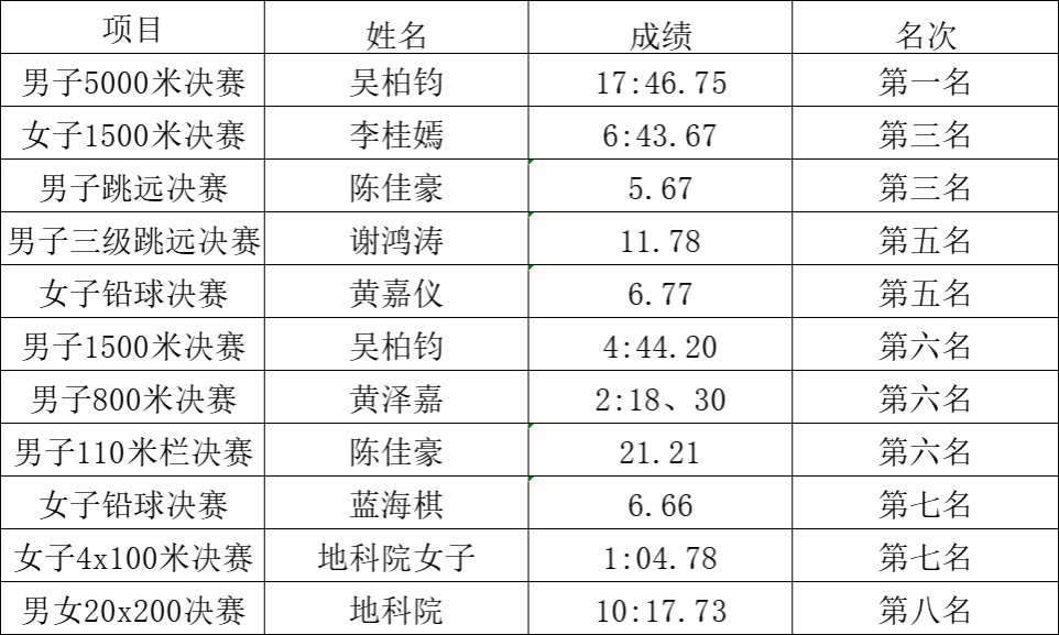 在全体运动员们顽强拼搏,团学工作人员们认真组织、热情服务和同学们积极参与下,本次运动会中,我院取得校运会团体总分第三名、体育道德风尚奖的优异成绩,彰显了地科院全体师生奋力拼搏的体育精神,健康的体魄以及团结合作的深厚情谊。