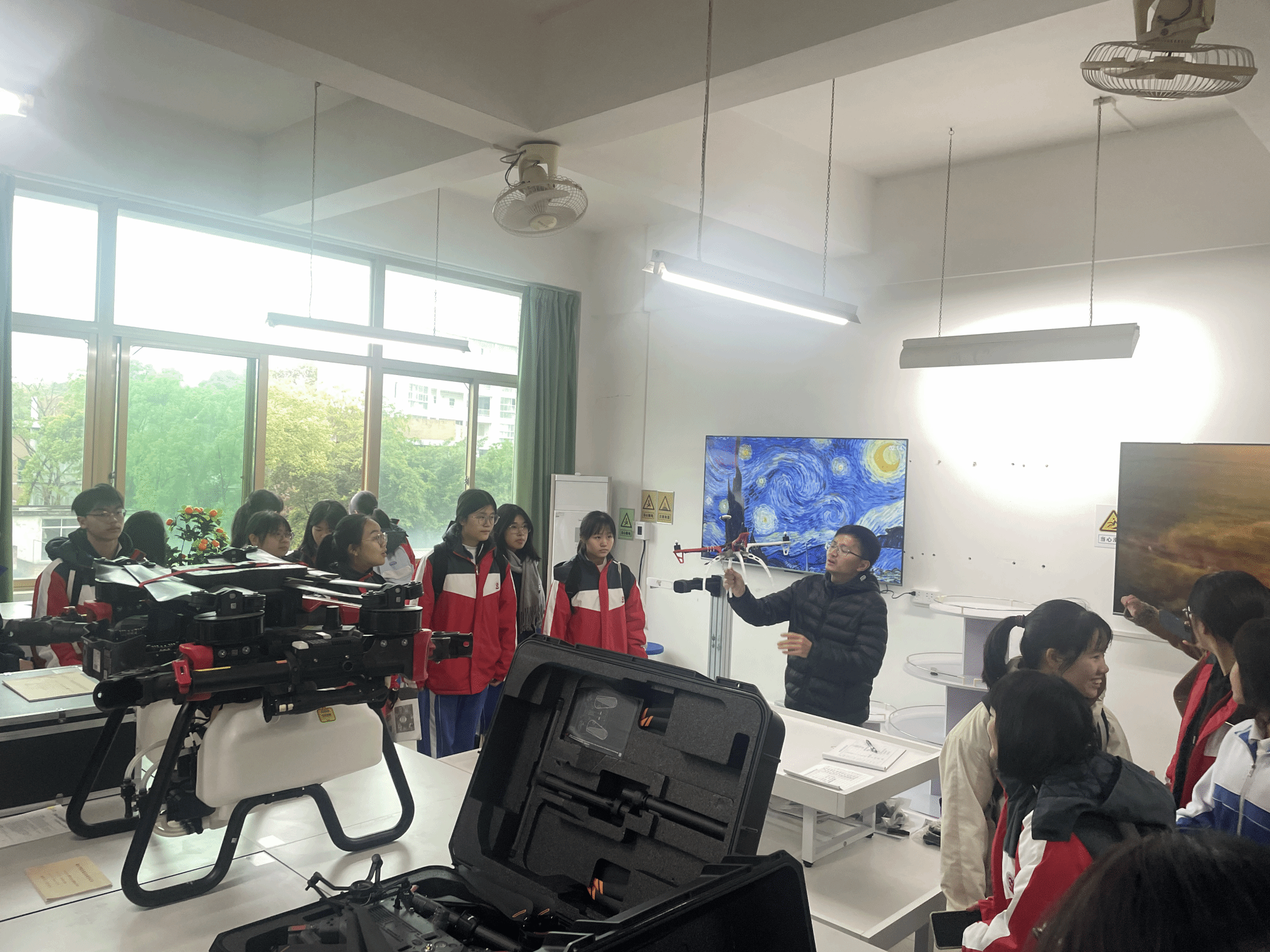 在林培松副院长、马小洪老师和王郁晗研究生带领指导下,中学生们现场观察了岩石矿物标本和地貌模型,了解了释光测年实验室的实验技术,参观了广东省山区特色农业资源保护与精准利用重点实验室,熟悉了无人机的构造和功能及其在农业、测绘、军事等方面的应用,见到了各种“神秘的”测绘仪器,接触了一些地理信息系统方面的学科前沿知识。