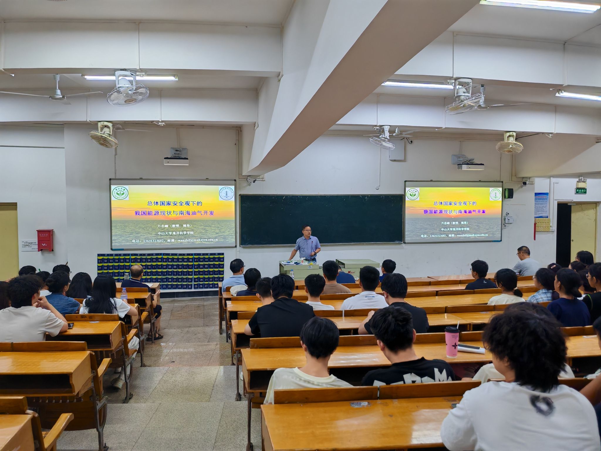 2025年9月28日晚,应地理科学与旅游学院邀请,中山大学海洋科学学院万志峰教授、南方海洋科学与工程广东省实验室(珠海)钟立峰 研究员、长安大学地球科学学院王冉教授在公颜实训大楼B407分别举行了题为《总体国家安全观下的我国能源现状与南海油气开发》、《南海的前世今生》、《个人遥感与三维重建应用》专题学术讲座。此次讲座由我院熊永柱教授主持,参会的有学院学科骨干、青年教师(刘友存教授、刘向军教授和黄雅君博士等)及我院各专业学生近160人。