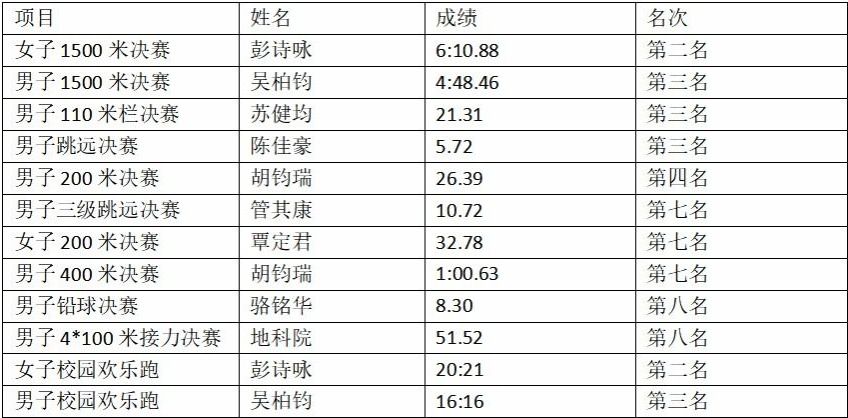 在全体运动员顽强拼搏,团学工作人员认真组织、热情服务和同学们积极参与下,本次运动会中,我院取得校运会团体总分三等奖、体育道德风尚奖、趣味运动会三等奖等多项荣誉,彰显了地科院全体师生奋力拼搏的体育精神和积极向上的精神风貌。