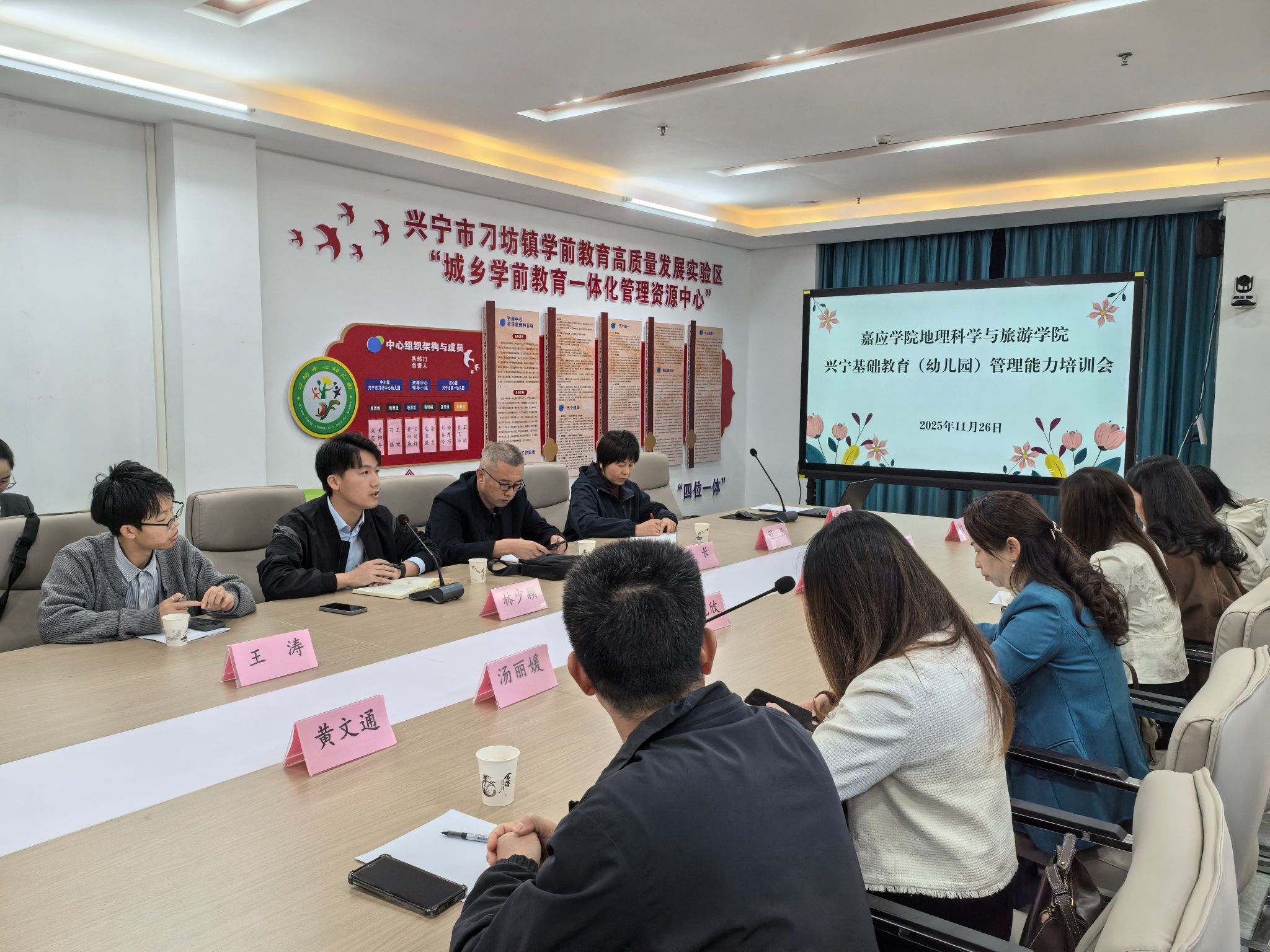 为深入贯彻落实《嘉应学院纵向帮扶欠发达地区“三所学校”和县中质量提升2025年工作方案》精神,推动乡村学前教育高质量发展,2025年11月26日,由我院副院长林少颖、王辉教授、辅导员王涛老师组成的工作组赴兴宁市刁坊中心幼儿园锦绣银湾园区,参加由兴宁市教育局与我院联合组织的“全市乡镇(街道)中心幼儿园管理能力培训会”,兴宁市教育局分管领导、基础教育与职业教育股及学前教育股负责同志,各乡镇(街道)中心幼儿园园长、骨干教师等一同参会。