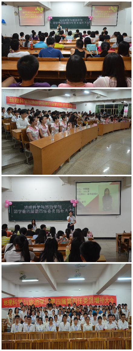 9月27日晚,地理科学与旅游学院在工B506召开了第四届第四任委员增补大会,学院党总支程洁如书记、学工办主任曾宇翔老师、辅导员黄颖老师、辅导员刘丽玫老师、兄弟学院团学代表及我院学生代表共200余人参加了此次大会。