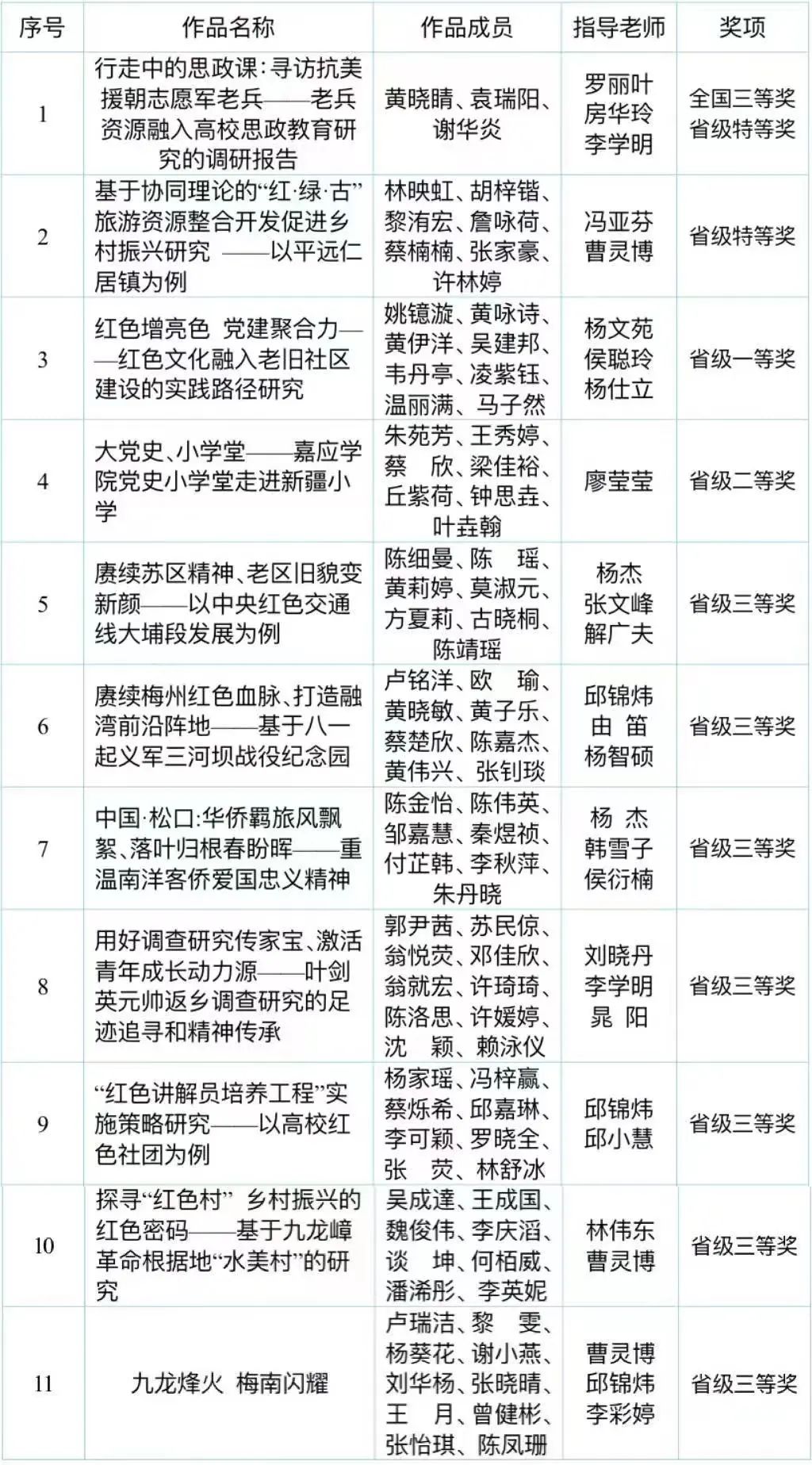 日前,2023年“挑战杯”竞赛红色专项赛已落下帷幕,作品经各级层层选拔推荐、反复精心打磨,最终我校在国赛、省赛中取得优异成绩,实现我校在“挑战杯”赛事上的历史性突破。其中,在第十八届“挑战杯”全国大学生课外学术科技作品竞赛红色专项活动中,我校推送的作品《行走中的思政课:寻访抗美援朝志愿军老兵——老兵资源融入高校思政教育研究的调研报告》斩获国赛三等奖,彰显了我校在学术科技领域的高品质教学水平和实践教学成果。第十七届“挑战杯”广东大学生课外学术科技作品竞赛红色专项活动中,我校荣获省赛特等奖2项,一等奖1项,二等奖1项,三等奖7项,展现了嘉应学子们勇于挑战的精神和奋发向上的青春风采。