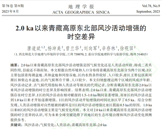 近日,嘉应学院地理科学与旅游学院与西北师范大学地环学院联合培养研究生唐道斌同学以第一作者在国内地理权威期刊《地理学报》上发表了题为《2.0 ka以来青藏高原东北部风沙活动增强的时空差异》的学术论文。
