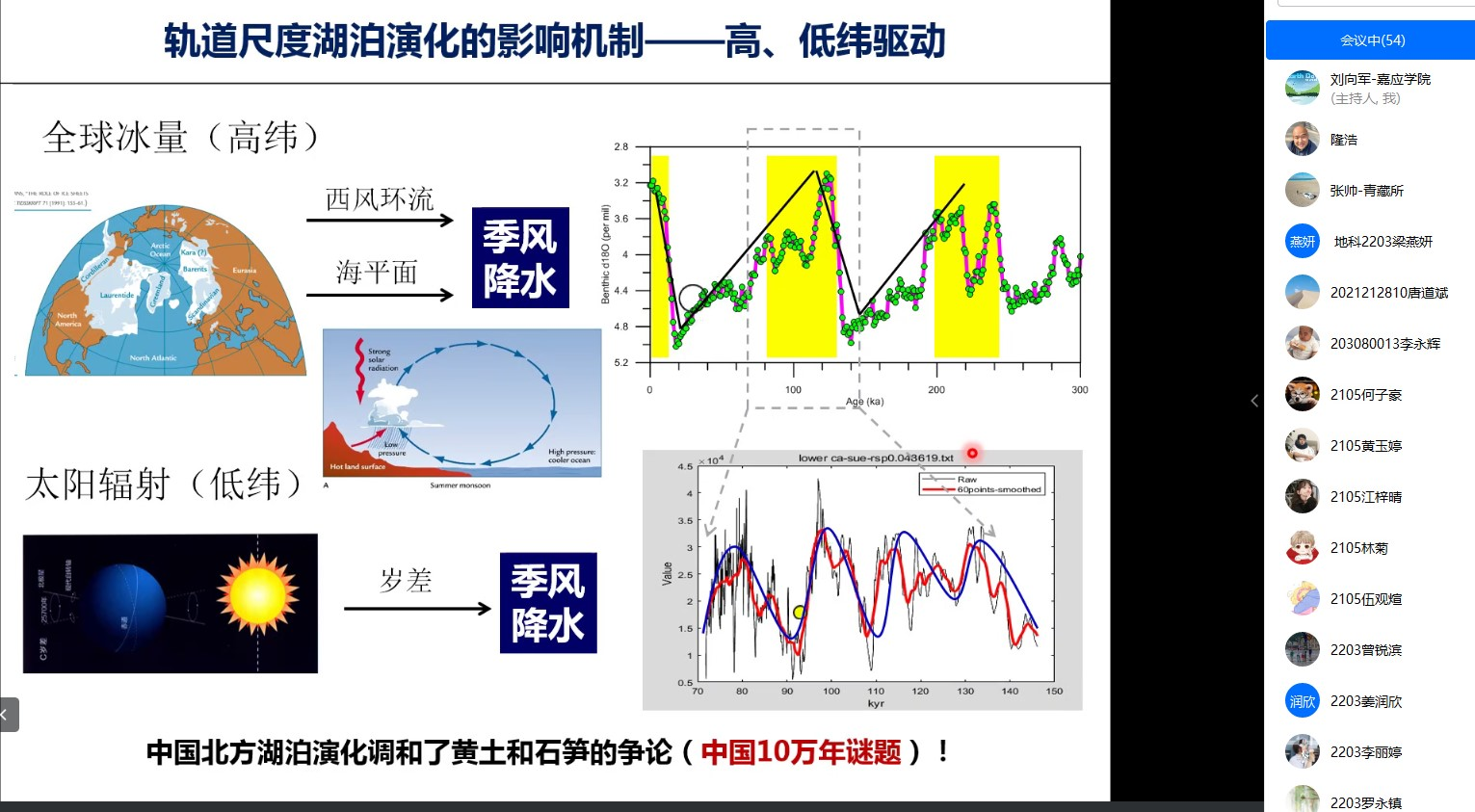 4月14日晚,中科院南京湖泊与地理所隆浩研究员应邀在线为我院师生做了题为“轨道尺度和千年尺度湖泊演化”的学术报告。参会的有学院学科负责人欧先交教授、学院高峰人才刘向军博士以及兄弟院校师生和学院本科生近90人。