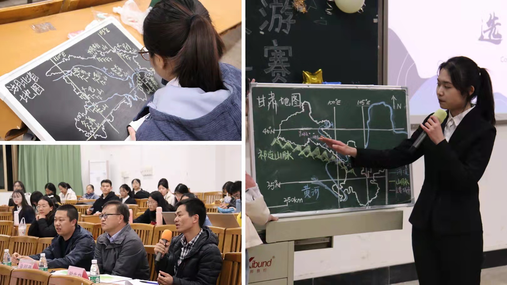 本次比赛的主题是“以手绘艺术,展现大国风采”。经过初赛的激烈角逐,共有15名选手脱颖而出,晋级决赛。决赛共分为两个环节,首先选手在规定时间内画出所抽选的我国省份轮廓图,标绘当地主要地形、河流与城市等。接着参赛选手需依次对绘制的地图进行讲解。最后两位评委老师根据手绘地图和现场讲解对参赛选手们进行提问和点评。比赛中,选手为我们展现了优秀的绘制地图能力、现场讲解能力和临场应变能力。