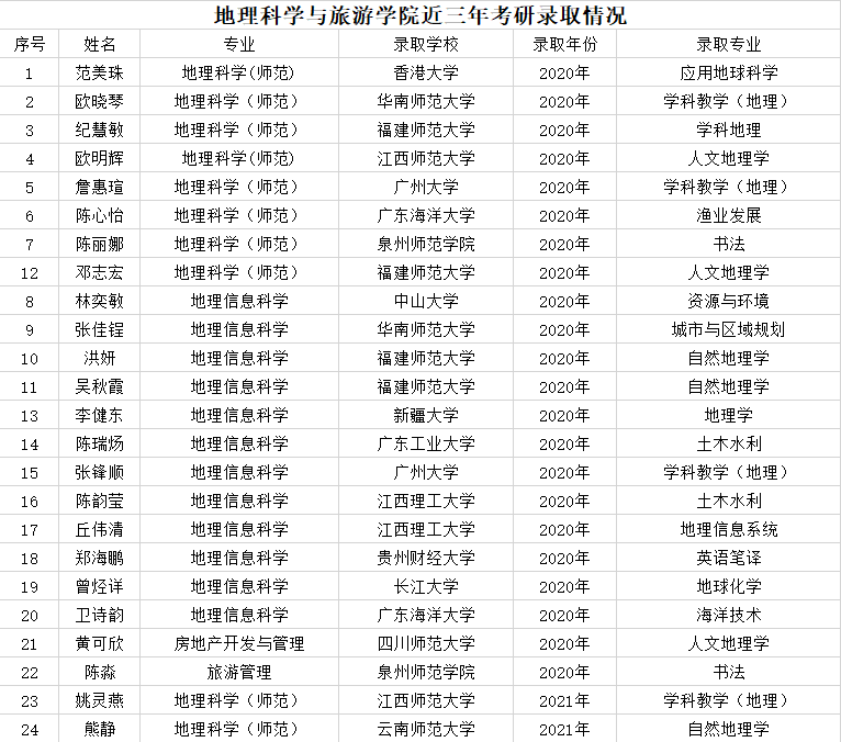 我院毕业生经过不懈努力,在院领导的大力支持和老师的悉心指导下,近三年共有48人考取研究生。其中1人被中山大学录取,1人被香港大学录取,3人被华南师范大学录取,此外还被湖南师范大学、新疆大学、广东工业大学、广州大学等知名高校录取。