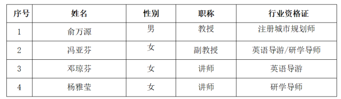 本专业专任教师总数为10人,其中教授3人,副教授2人,讲师4人,实验师1人,博士5人,硕士3人。10位专任教师专业背景涵盖旅游管理、酒店管理、旅游文化、人文地理、自然地理、城乡规划等多个专业门类,且大部分教师具有行业背景或行业经验。本专业共有4名双师型教师,其中注册城市规划师1人,外语导游2人,研学导师2人。专任教师队伍具备良好的专业知识结构,师资配置能够满足教学要求。