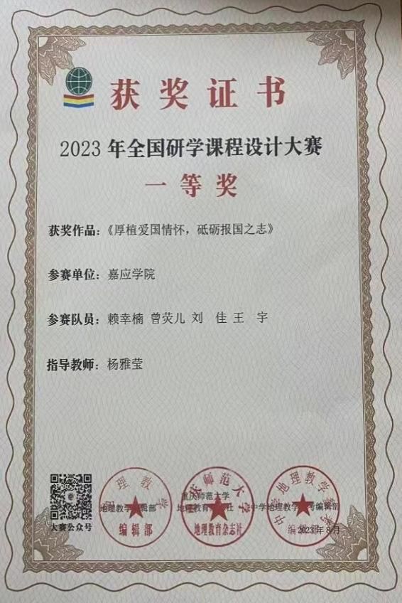 全国研学课程设计大赛 | 国家级 | 一等奖 | 杨雅莹 | 2023年 |