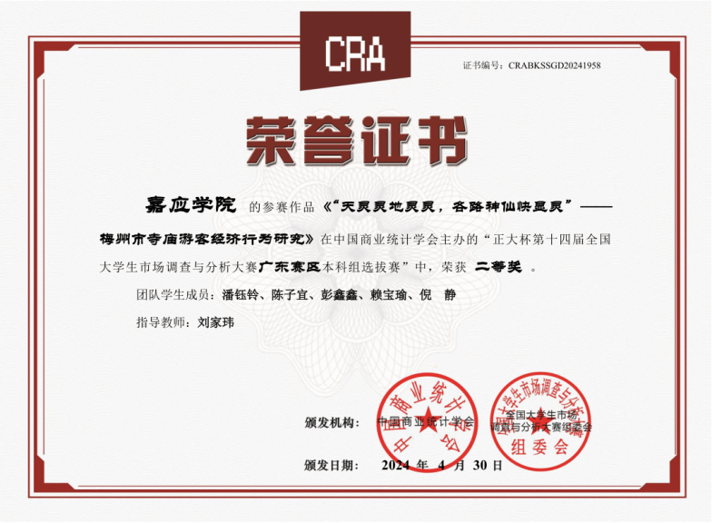 全国大学生市场调查与分析大赛(广东赛区) | 省级 | 三等奖 | 刘家玮 | 2023年 |