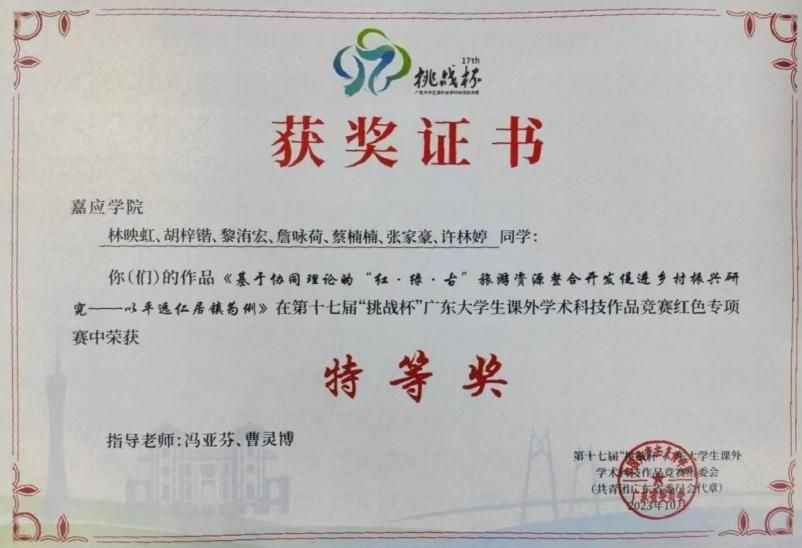 攀登计划 | 基于协同理论的“红·绿·古”旅游资源整合开发促进乡村振兴研究——以平远仁居村为例 | 校级重点/省级特等 | 冯亚芬、曹灵博 | 2023年 |