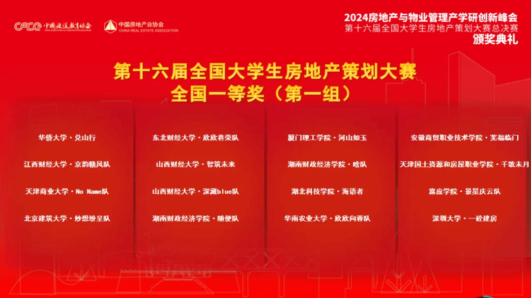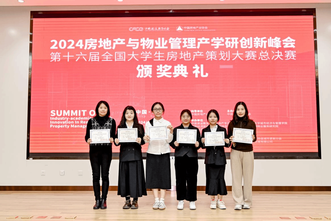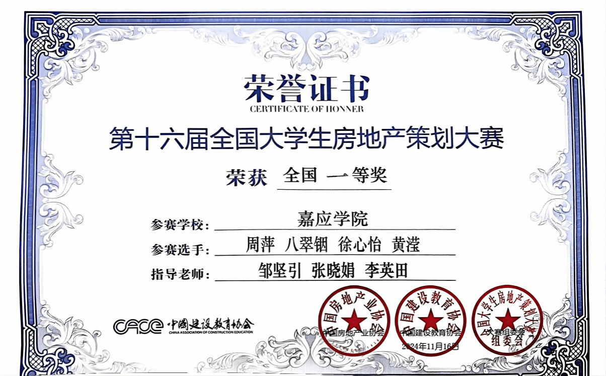近日,在备受瞩目的第十六届全国大学生房地产策划大赛总决赛中,我院房地产开发管理专业的周萍、徐心怡、八翠铟、黄滢四位同学组成的参赛团队表现卓越,凭借出色的策划方案和精彩的现场展示,荣获大赛一等奖。邹坚引、张晓娟两位老师担任指导教师,精心指导学生团队,李英田、谢正峰、雷汝林三位老师提供了特别支持,共同为此次获奖奠定了坚实基础。