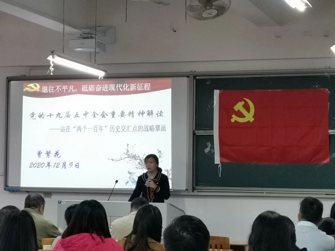 为深入理解和学习贯彻落实党的十九届五中全会精神,提高党员同志的思想觉悟和政治修养,2020年12月9日下午,学院党委在公颜实训大楼C座414举行学习贯彻党的十九届五中全会精神专题辅导报告会,邀请了学校宣讲团成员曾繁花博士主讲。报告会由学院党委书记陈义彬主持,学院全体师生党员参与了此次学习活动。