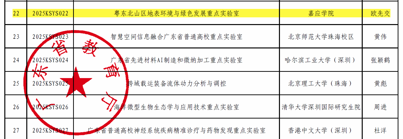 近日,广东省教育厅发布了2025年度广东省普通高校重点科研平台和项目立项名单。我院欧先交教授牵头申报的“粤东北山区地表环境与绿色发展重点实验室”成功获批为广东省普通高校重点实验室。该实验室响应国家生态文明建设、“绿美广东”生态建设等重大战略需求,依托粤东西北地区唯一一个地理学广东省优势重点学科,以及释光测年实验室、无人机遥感应用省级校企联合实验室、旅游发展研究中心等多个科研平台,聚焦山区地表过程与地貌演化、水土资源与灾害监测预警、生态环境与绿色发展3个相互关联方向的研究。
