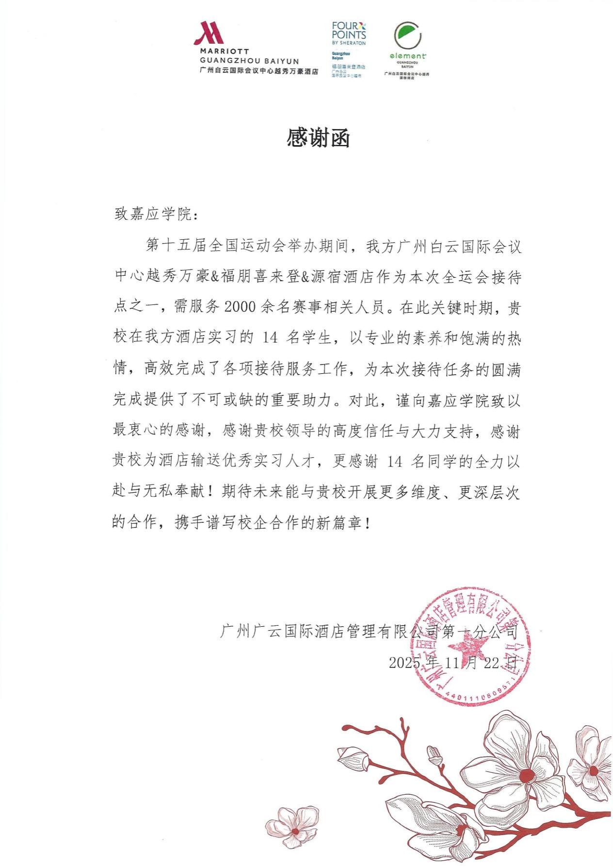 双方围绕学生的实习表现、职业发展路径及行业人才需求等方面进行了深入交流。近日,在刚结束的第十五届全国运动会期间,我系共有14名实习生参与了赛事接待服务。学生们以专业的素养和饱满的热情,高效完成了各项接待任务,为全运会接待工作的顺利开展提供了重要支持。酒店 向学校发出感谢函,对学生的优异表现表示高度赞赏,并对学校在校企合作中给予的信任与支持表示衷心感谢。